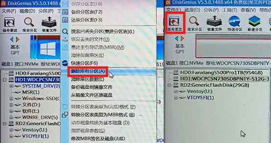 选中机械/固态硬盘 → 右键「删除所有分区」→ 点「保存更改」→ 确认。