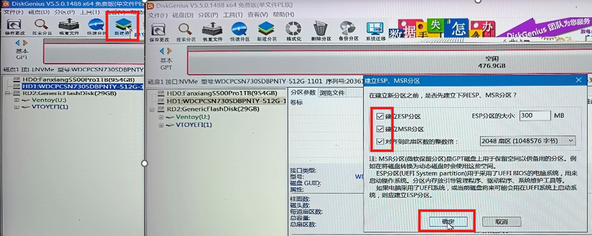 ③ 用微 PE 里的 DiskGenius 把新硬盘分成「系统盘 + 拓展盘」,并自动创建 ESP/MSR 引导分区。