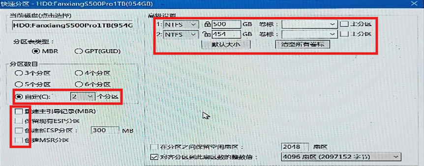 勾选「创建 ESP 分区」+「创建 MSR 分区」